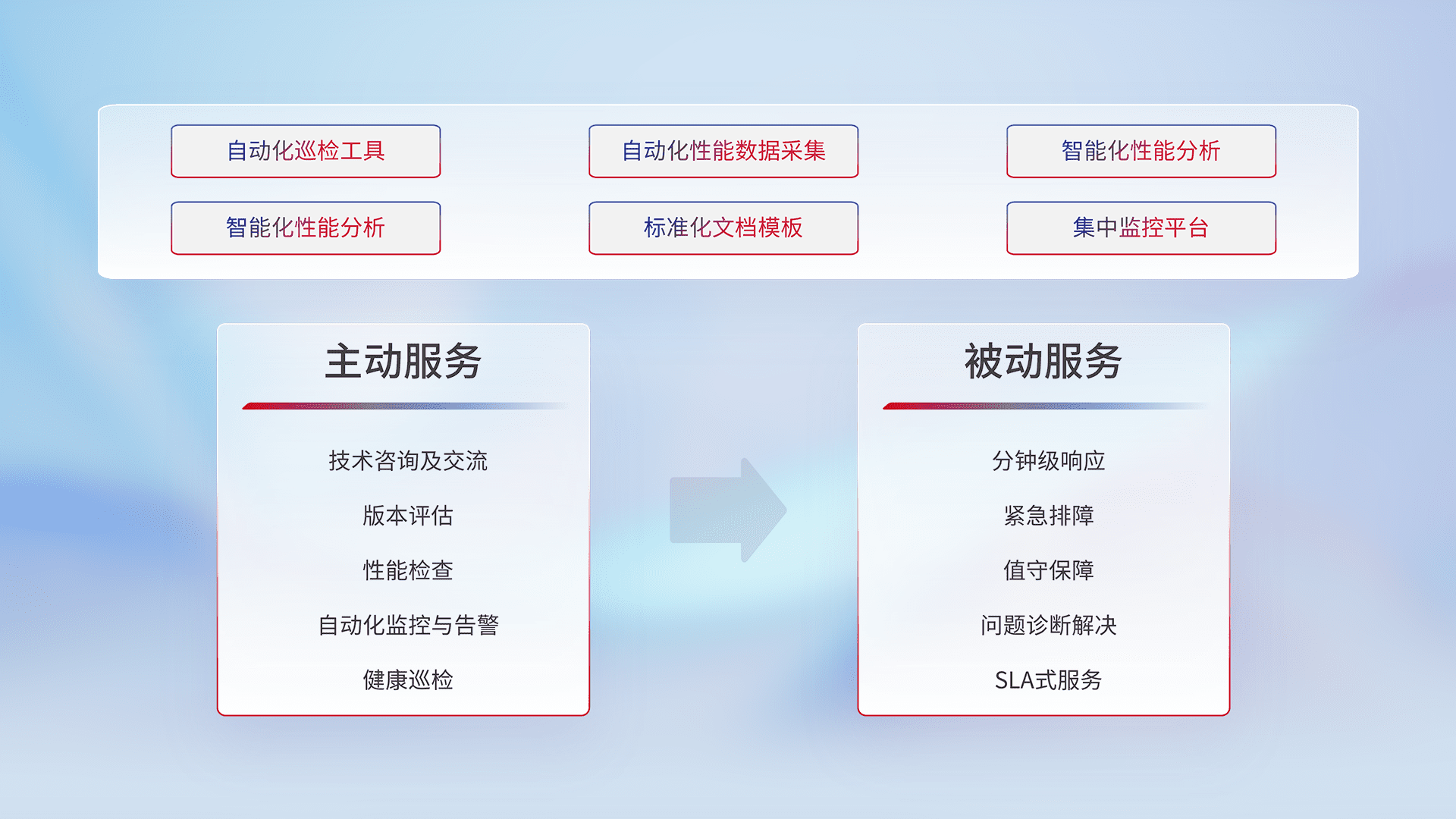 智能化工具和标准化文档,,保障服务质量,,,提供主动服务(包含技术咨询、、版本评估、、、性能检查、、自动化监控与告警、、、、健康巡检)和被动服务包含(分钟级响应、、、、紧急排障、、值守保障、、问题诊断解决、、、SLA服务)。。